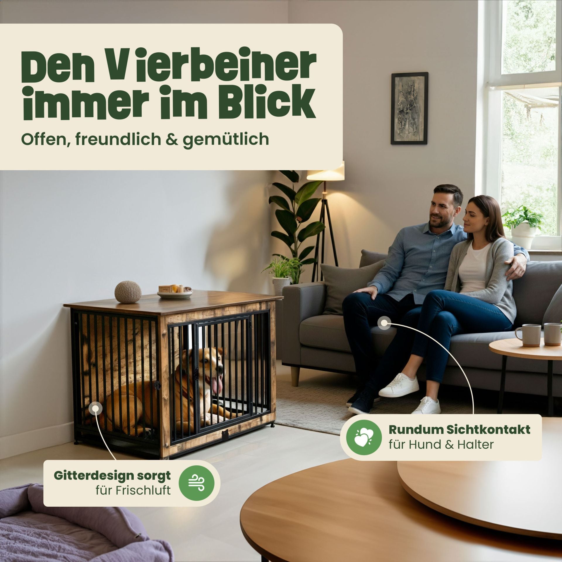 Das Hundehaus Max ist mehr als nur eine Hundebox – es ist Rückzugsort, Möbelstück und Wohnaccessoire zugleich. Mit rustikalem Holzdesign und stabilem Metallrahmen fügt es sich harmonisch in jedes Zuhause ein und bietet deinem Hund einen sicheren und gemütlichen Platz zum Entspannen.