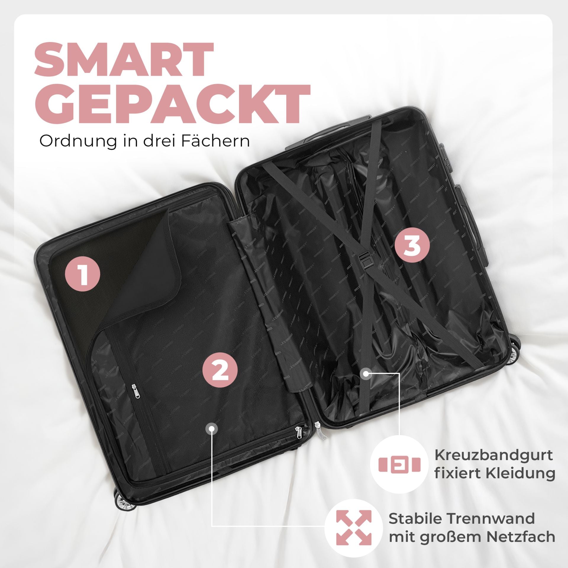 Das Kofferset bietet dir drei Größen in einem edlen Rose Gold-Finish. Mit 20", 24" und 28" bist du für Kurztrip, Urlaub oder Geschäftsreise perfekt ausgestattet.