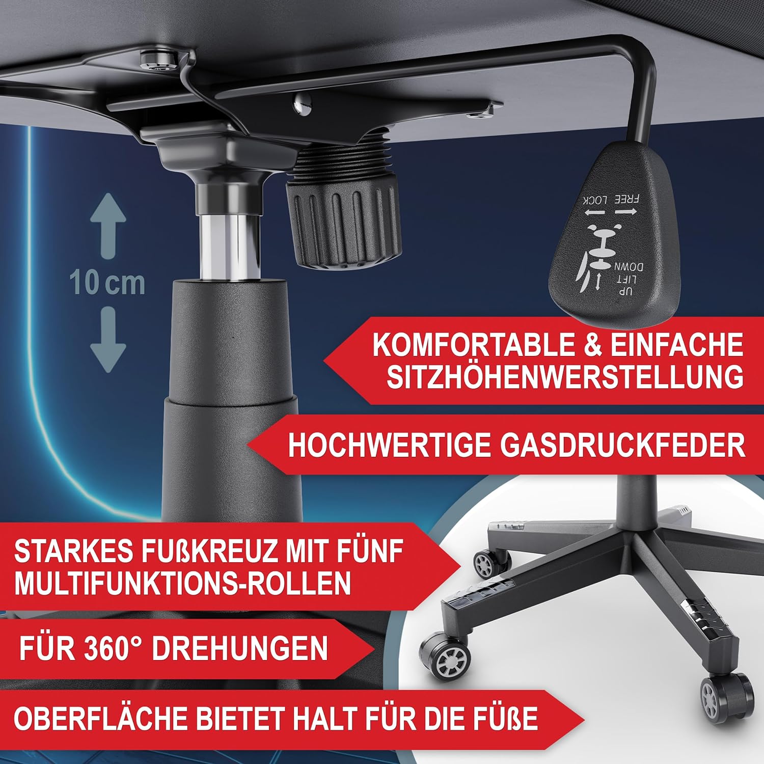 Der Premium Gaming Stuhl bietet eine Top-Ausstattung, die jeden Gamer überzeugt. Mit leisen 360° Universal-Rollen, gepolsterten Armlehnen, einzigartiger Rückenverstellung, herausragender Ergonomie und einem verstellbaren Nackenkissen bietet dieser PC-Computerstuhl höchsten Komfort und Funktionalität.