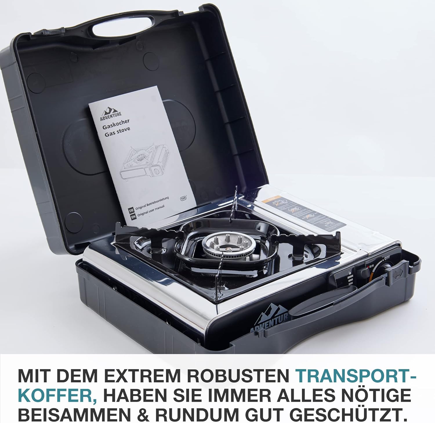 Der TOM Edelstahl Gaskocher GK-227 Everest ist perfekt für Camping, Reisen und Festivals. Er kommt mit einem robusten Aufbewahrungskoffer aus schlagfestem Kunststoff, der ihn kompakt und leicht transportierbar macht.