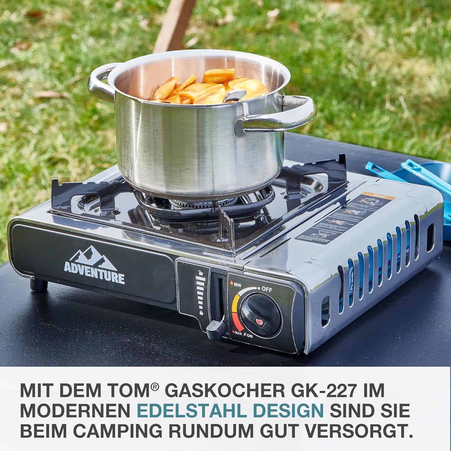 Egal ob Mittag- oder Abendessen, der Gaskocher bereitet Ihre Mahlzeiten schnell zu. Mit dem TOM Edelstahl Gaskocher-Set sind Sie bestens für Ihre Outdoor-Abenteuer gerüstet. Genießen Sie die bewährte TOM Markenqualität und machen Sie Ihre Outdoor-Erlebnisse komfortabler und sicherer.