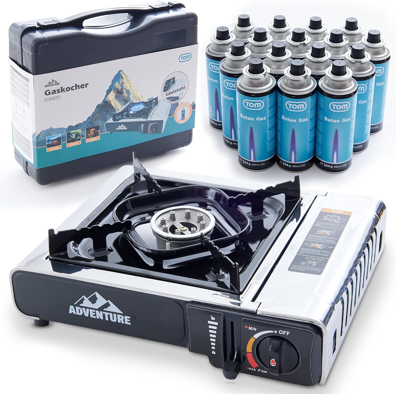 Campingkocher Edelstahl + 16 Butangas-Kartuschen CG-227