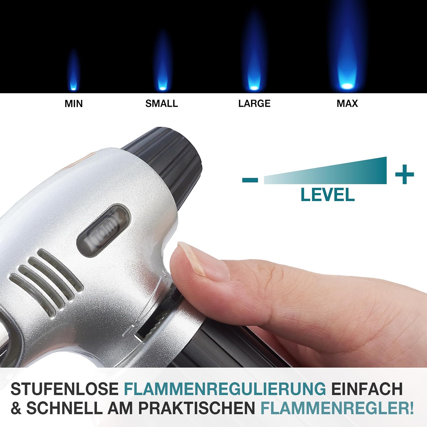 • SICHERE ANWENDUNG – Piezozündung per Knopfdruck. Die Flamme des Butangasbrenner kann für längere Arbeiten festgestellt werden und erleichtert das Hartlöten. Mit praktischer stufenloser Flammenregulierung