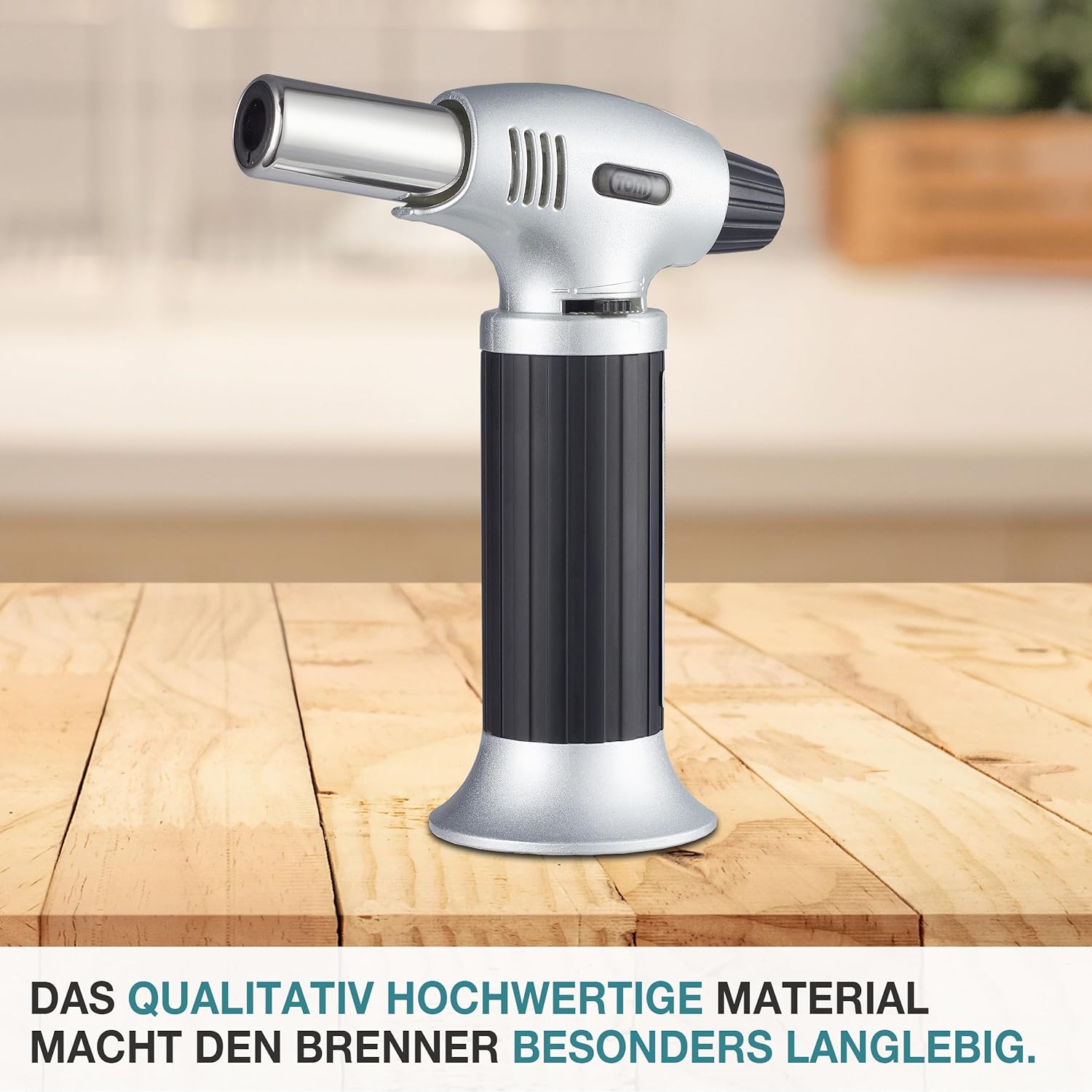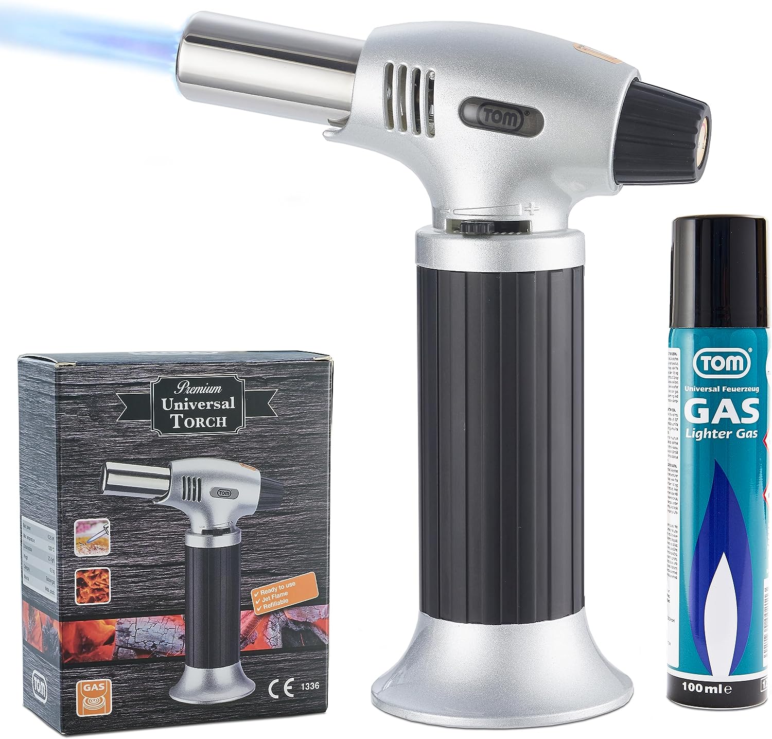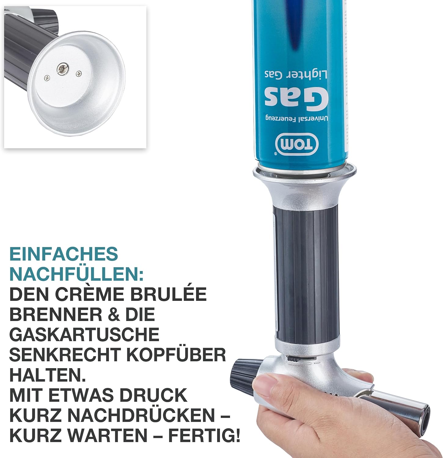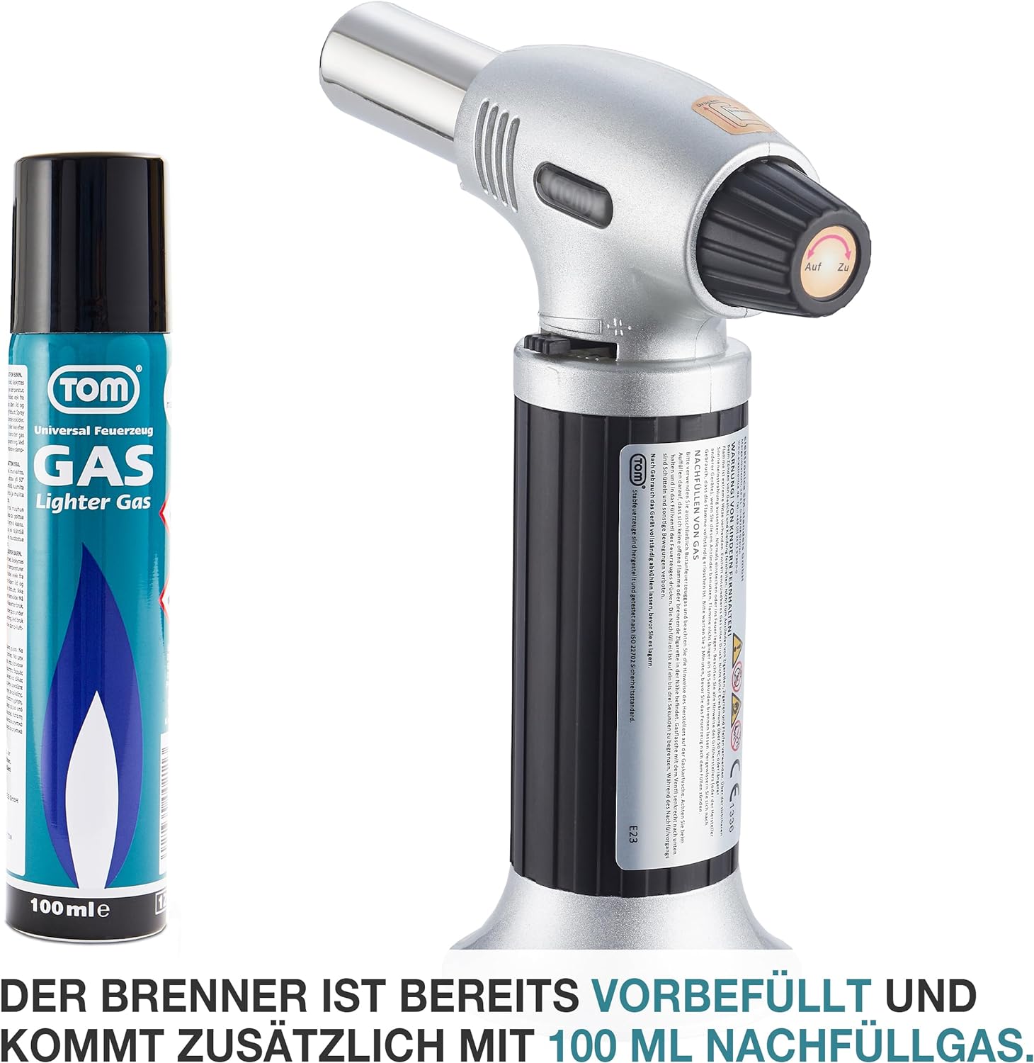 TOM Creme Brulee Brenner - MIT Gas befüllt – inkl. 1 x 100 ml Gas Kartusche zum Nachfüllen – Bunsenbrenner mit 1300°C Flamme – Küchenbrenner , Camping & Werkstatt – Flambierbrenner Küche