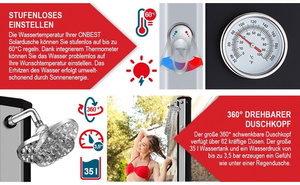 Die Solardusche Ocean bietet hochwertigen Duschkomfort im Garten oder am Pool. Mit einer stufenlosen Wassertemperaturregelung bis 60°C und einem integrierten Thermometer können Sie das Wasser auf Ihre Wunschtemperatur einstellen. Das umweltschonende Erhitzen erfolgt durch Sonnenenergie, was die Dusche besonders nachhaltig macht.