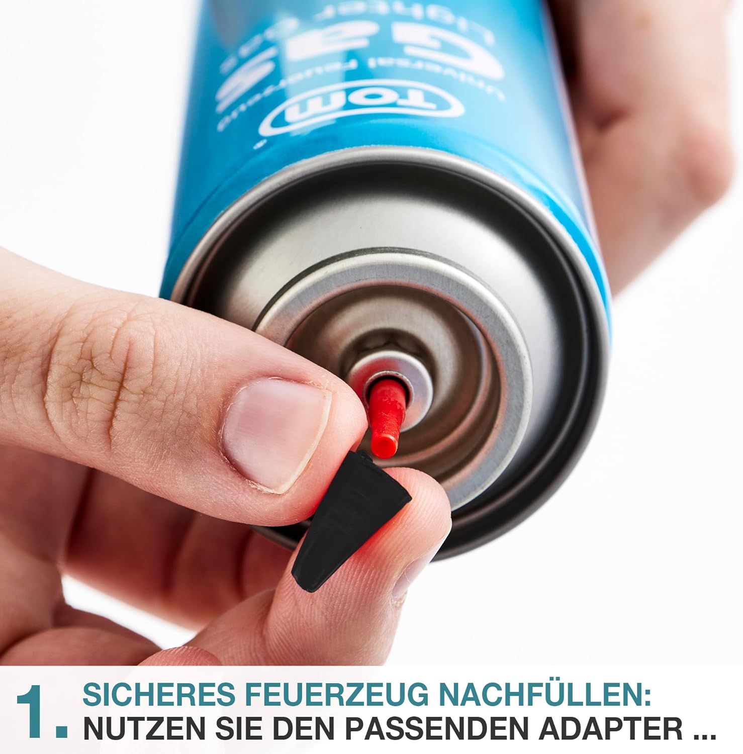- Nachfüllen leicht gemacht: Feuerzeug kopfüber halten, Kartusche in die Öffnung setzen und kurz nach unten drücken