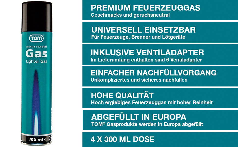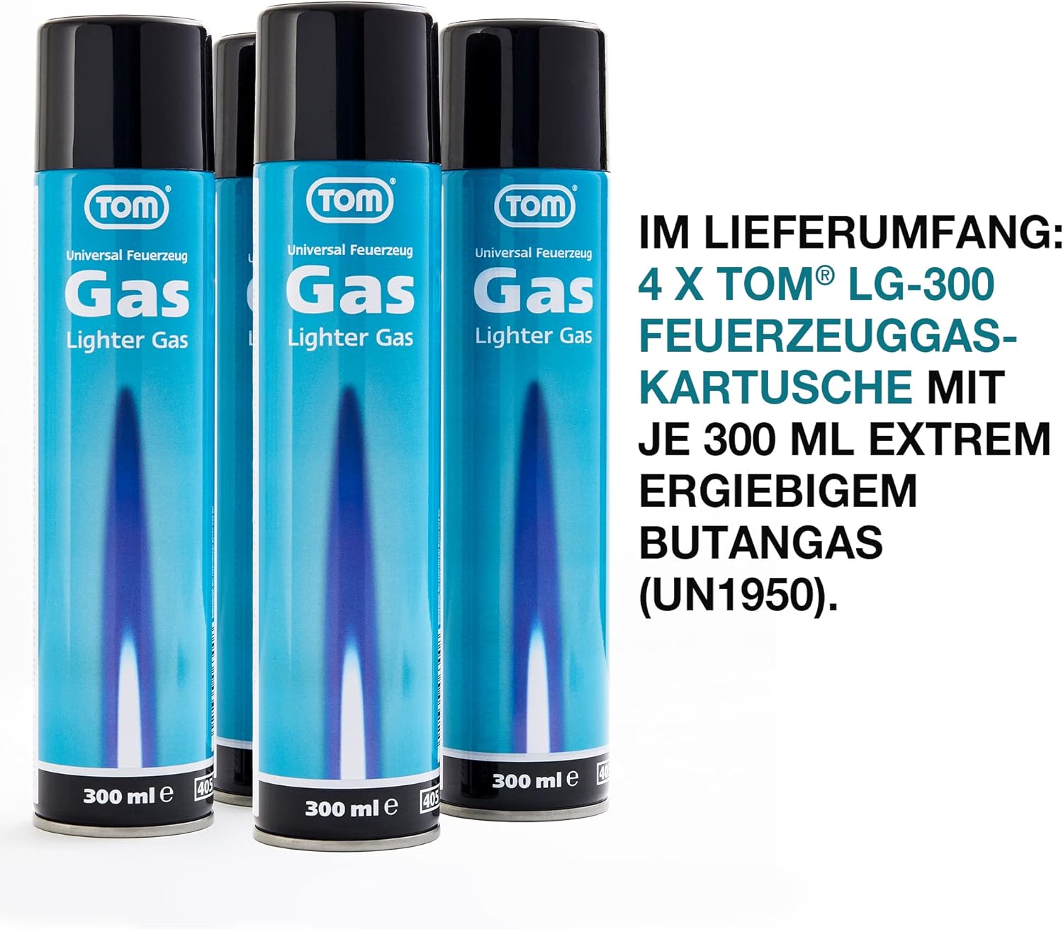 Feuerzeuge sind unverzichtbar in unserem Alltag. Ob für Sturmfeuerzeuge, Stabfeuerzeuge oder Küchenbrenner – ohne Flamme geht nichts. Mit der TOM Universal Feuerzeug Gas Nachfüllkartusche LG-300 haben Sie immer eine Lösung parat. Das hochwertige Butangas eignet sich ideal zum Nachfüllen aller Arten von Feuerzeugen.