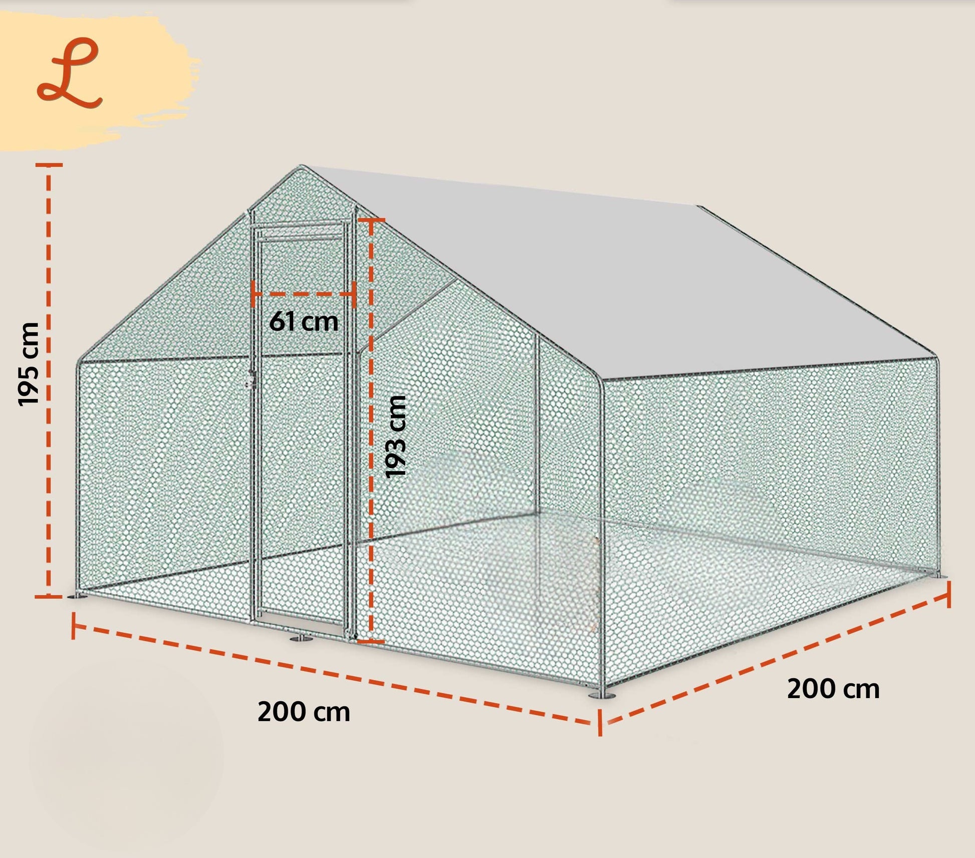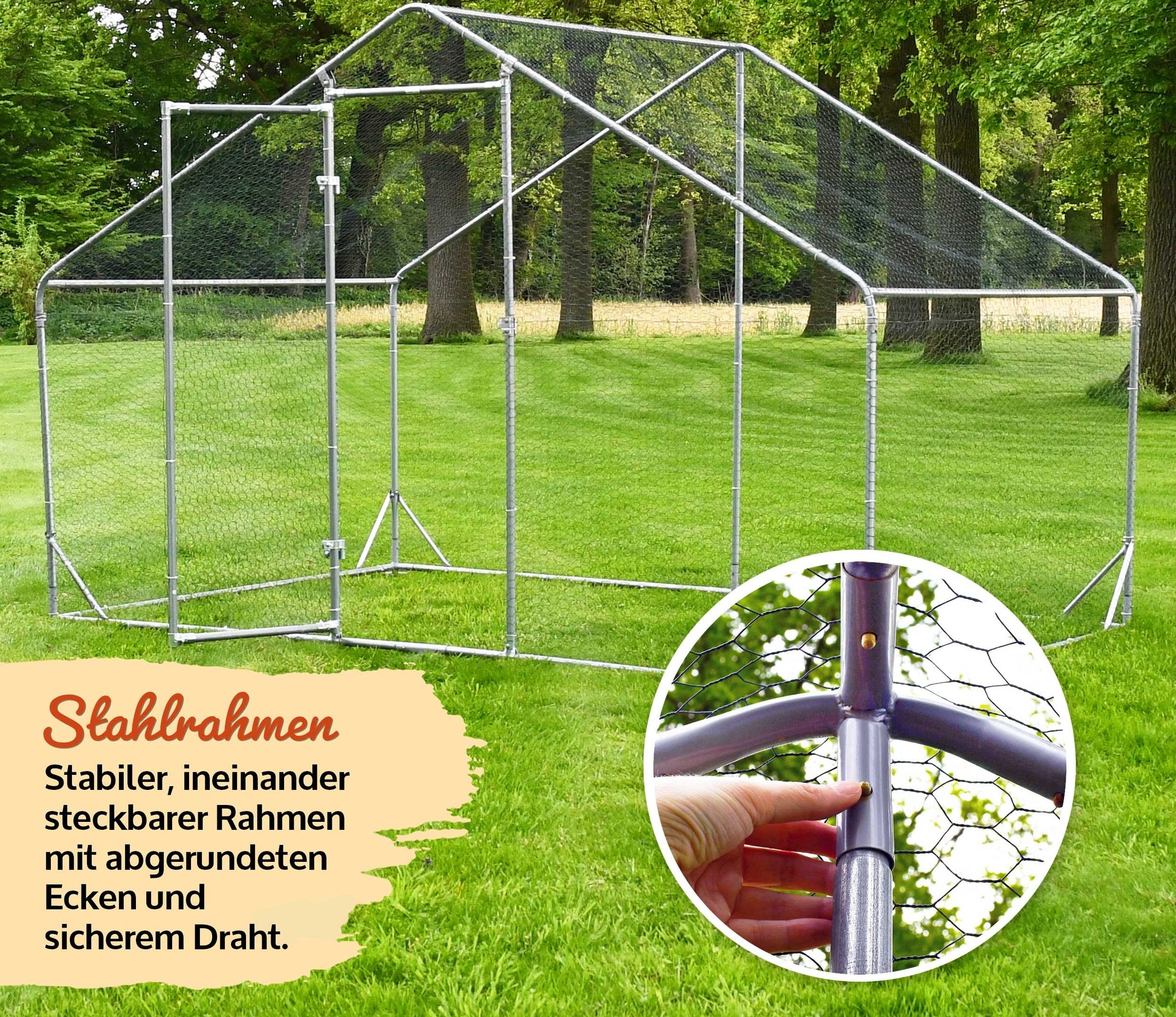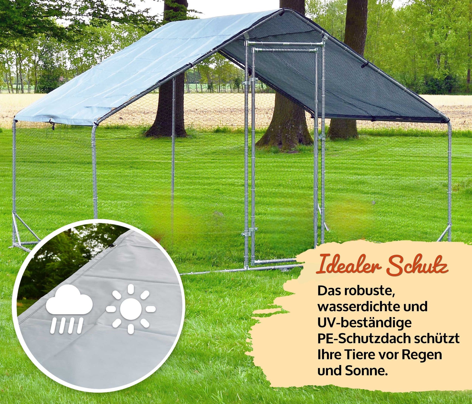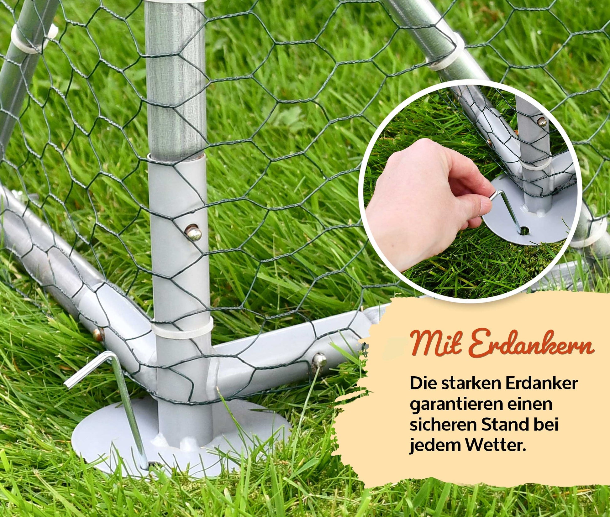 Das L Freilaufgehege aus Metall ist die ideale Lösung für die artgerechte Haltung von Hühnern, Kaninchen und anderen Kleintieren. Mit seinem robusten Metallrahmen und dem witterungsbeständigen Dach bietet es Schutz vor Sonne, Regen und Raubtieren, während der große Freilaufbereich viel Platz für Bewegung und Scharren ermöglicht.
