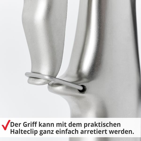 - Hebel kann mit einer Metallöse festgestellt werden – kein ständiges Durchdrücken erforderlich