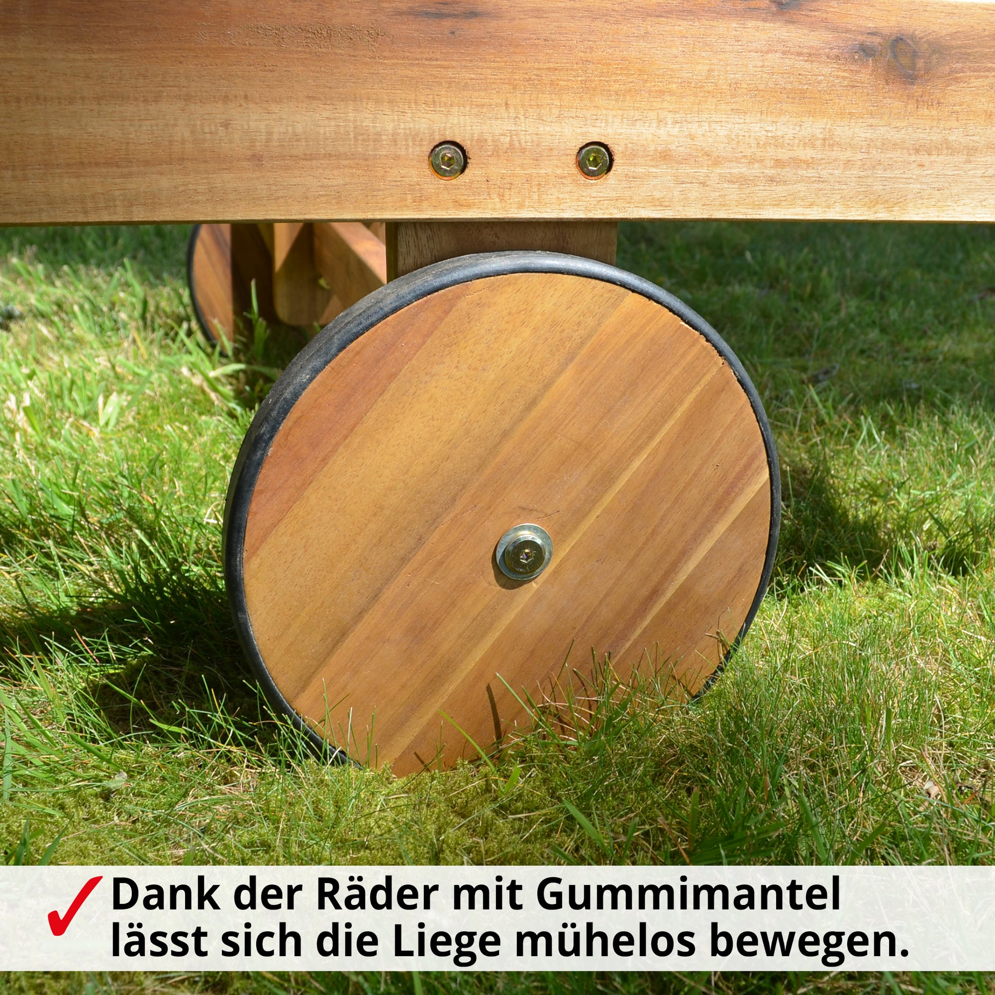 - Holzräder mit Gummimantel ermöglichen ein einfaches Verschieben der Liege