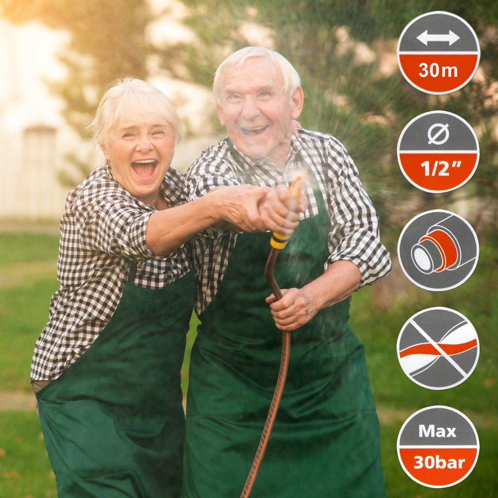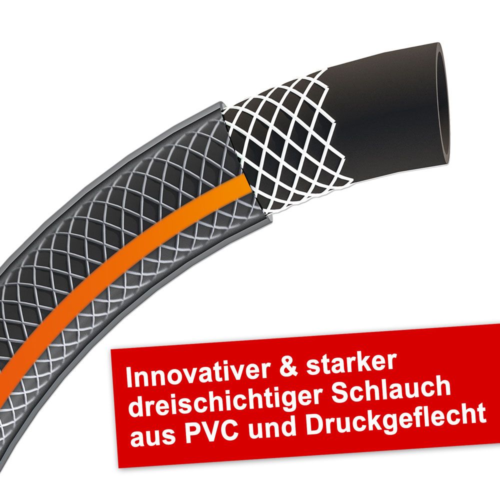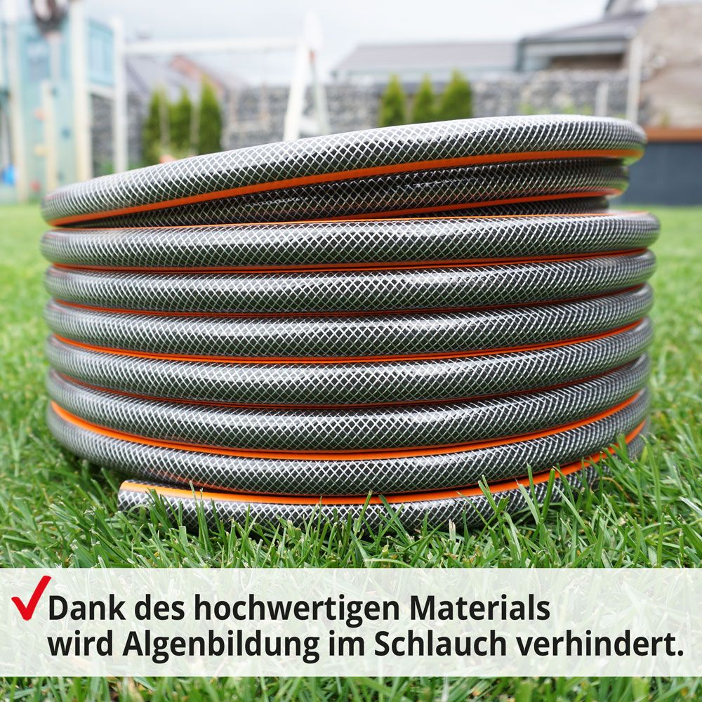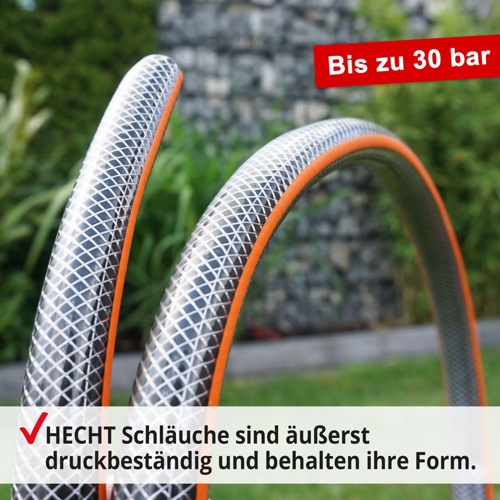 Der äußerst langlebige HECHT AQUA 30 m Gartenschlauch ist ein haltbarer dreischichtiger PVC-Schlauch, der aus einer Kombination von weichem PVC und einem Druckgeflecht aus synthetischen Fasern besteht. Die innere schwarze Schicht verhindert effektiv die Bildung von Algen und schützt vor UV-Strahlen. Die mittlere Schicht aus synthetischen Fasern verleiht dem Schlauch einen hohen Druckwiderstand, während die glatte Außenschicht eine hohe Abriebfestigkeit bietet und ein besseres Gleiten auf dem Boden ermöglicht.