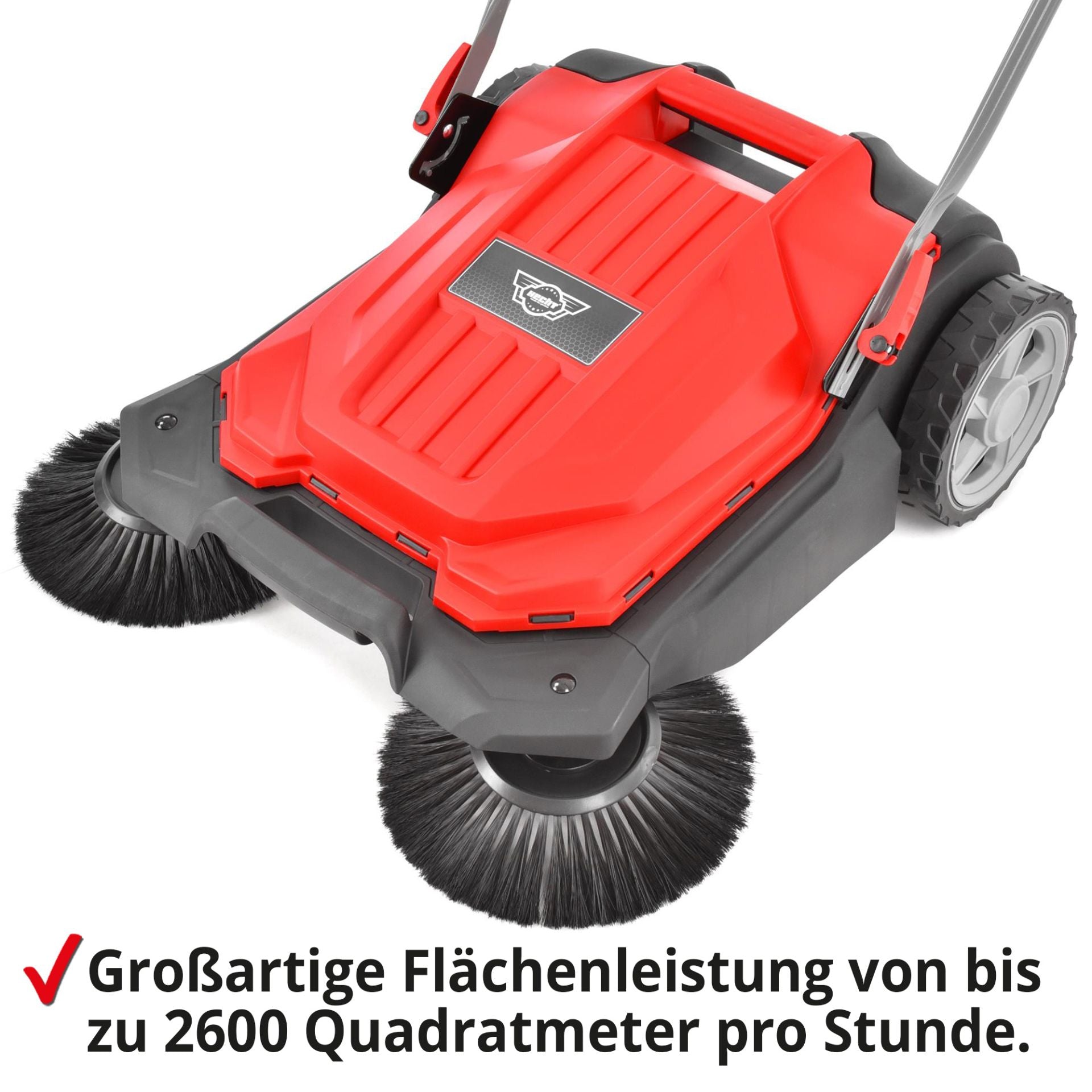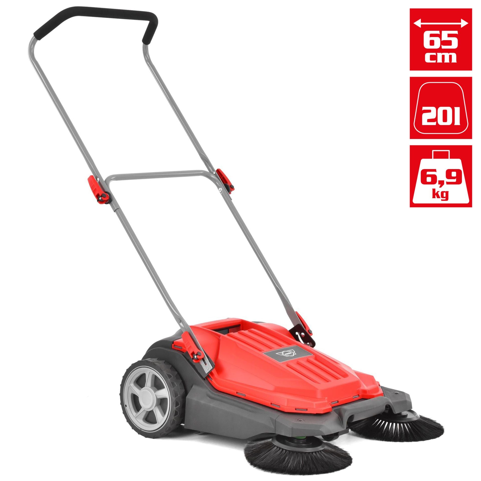 Die Handkehrmaschine ist die perfekte Wahl für die schnelle und mühelose Reinigung von Höfen, Gehwegen und Garageneinfahrten. Mit einer großzügigen Arbeitsbreite von 65 cm und Seitenbürsten auf beiden Seiten erreicht sie eine beeindruckende Flächenleistung von bis zu 2600 m² pro Stunde. Die robuste Kunststoffkehrbürste und der 20-Liter-Sammelbehälter sorgen dafür, dass Schmutz zuverlässig aufgenommen wird. Dank der Griffhöhenverstellung in drei Stufen und des Softgriffs ist die Handhabung besonders komfortabel.