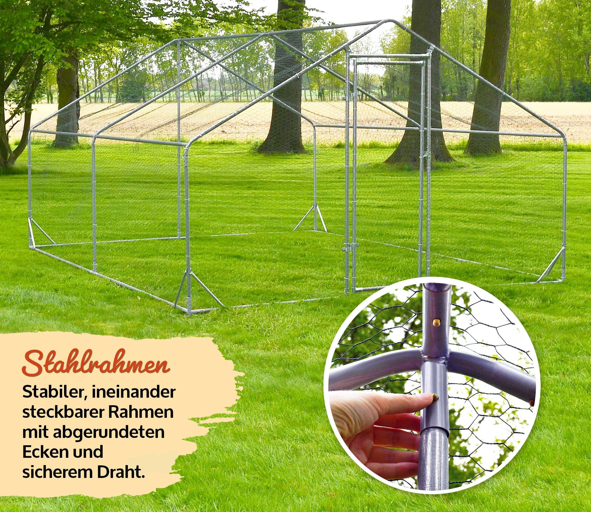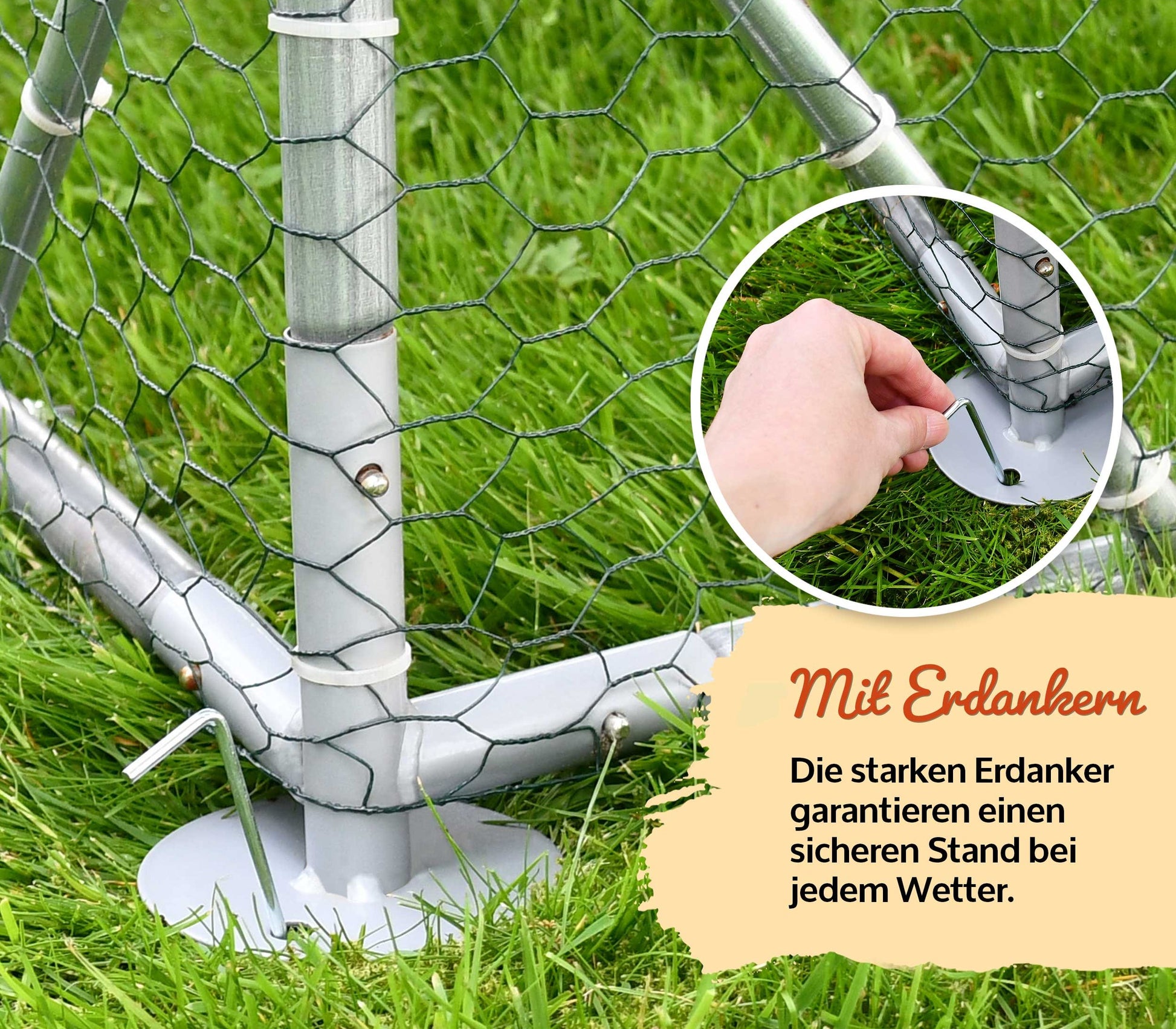 Das XL Freilaufgehege aus Metall ist die ideale Lösung für die artgerechte Haltung von Hühnern, Kaninchen und anderen Kleintieren. Mit seinem robusten Metallrahmen und dem witterungsbeständigen Dach bietet es Schutz vor Sonne, Regen und Raubtieren, während der große Freilaufbereich viel Platz für Bewegung und Scharren ermöglicht.