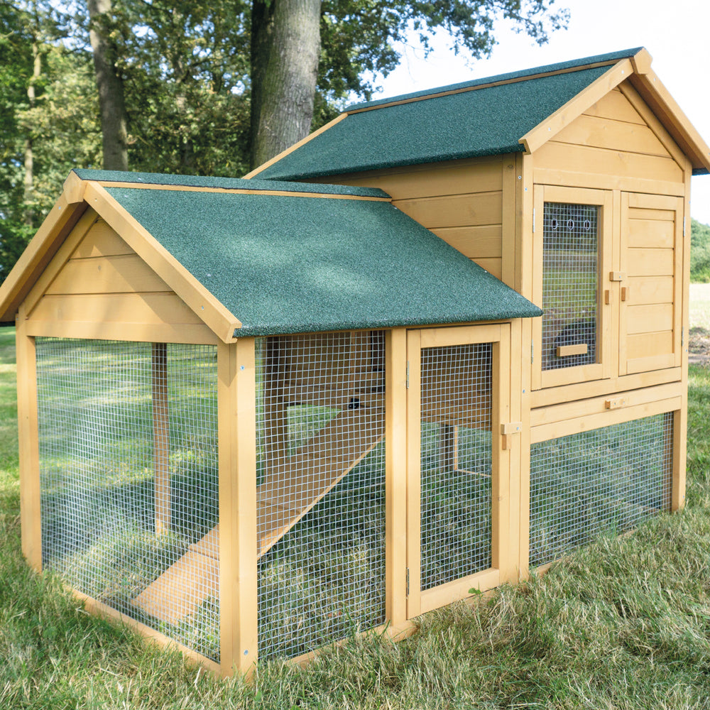 Der große Kaninchenstall "Hasenfarm" bietet viel Platz zum Schlafen und Toben. Die breite Rampe ermöglicht den Tieren einfaches Hoch- und Runterhoppeln. Hochwertige Verarbeitung und langlebige Materialien sorgen für eine artgerechte Haltung mit viel frischer Luft.