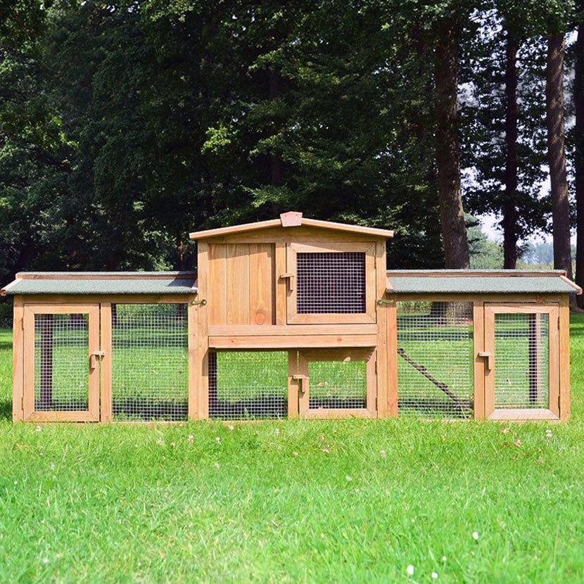 Der Stall Sheriff ist ein ganz besonders großzügiger Nagerstall mit viel Platz für die Tiere zum Hoppeln. Getränkeflaschen können Sie an der großen Drahtfläche beliebig anbringen und einen Trog mit Futter in den geschützten Bereich stellen. Für frisches Gras wechseln Sie ab und zu die Stellfläche.