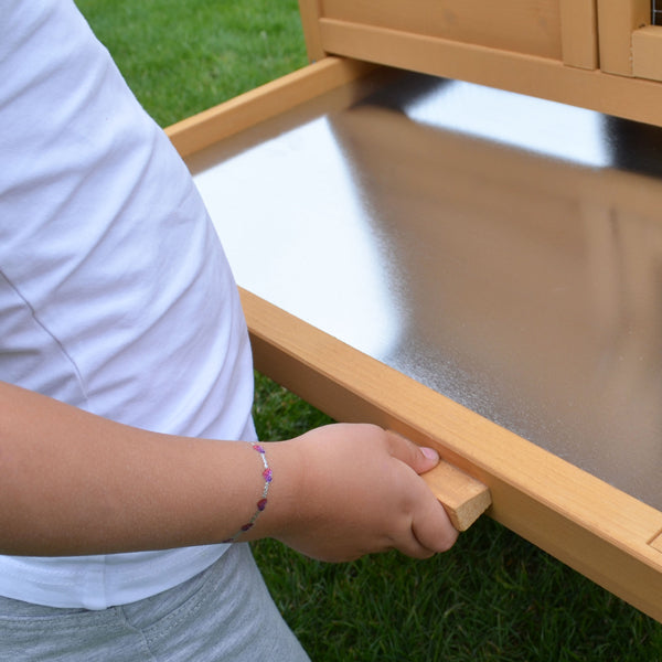Große Kotschublade unter dem Stall für einfache Entsorgung des Mistes