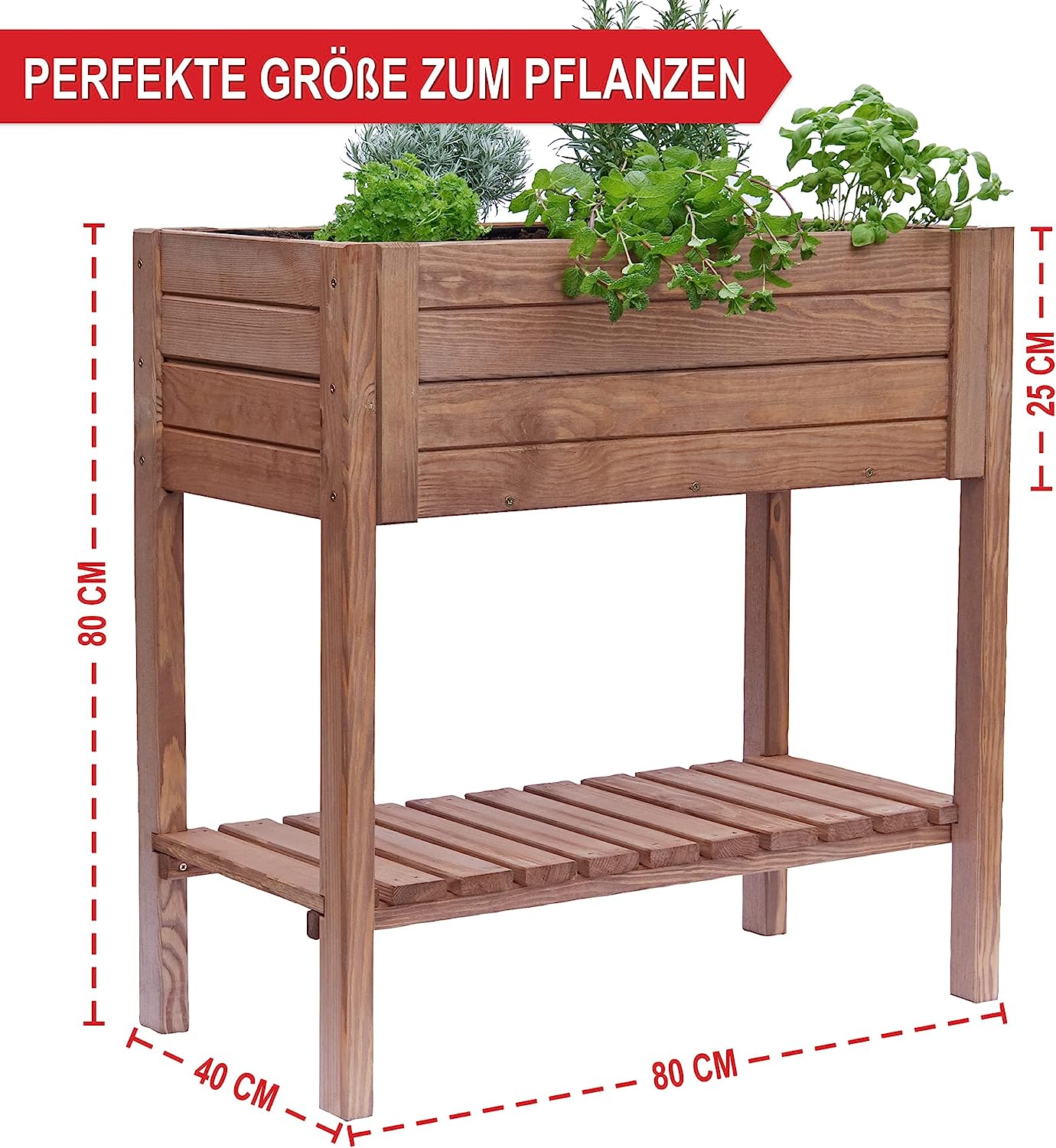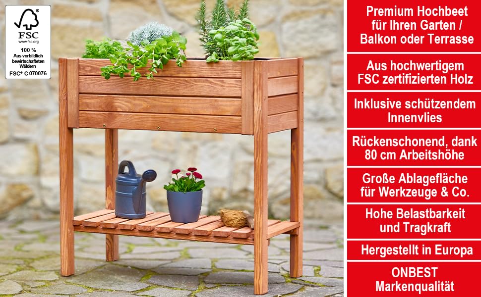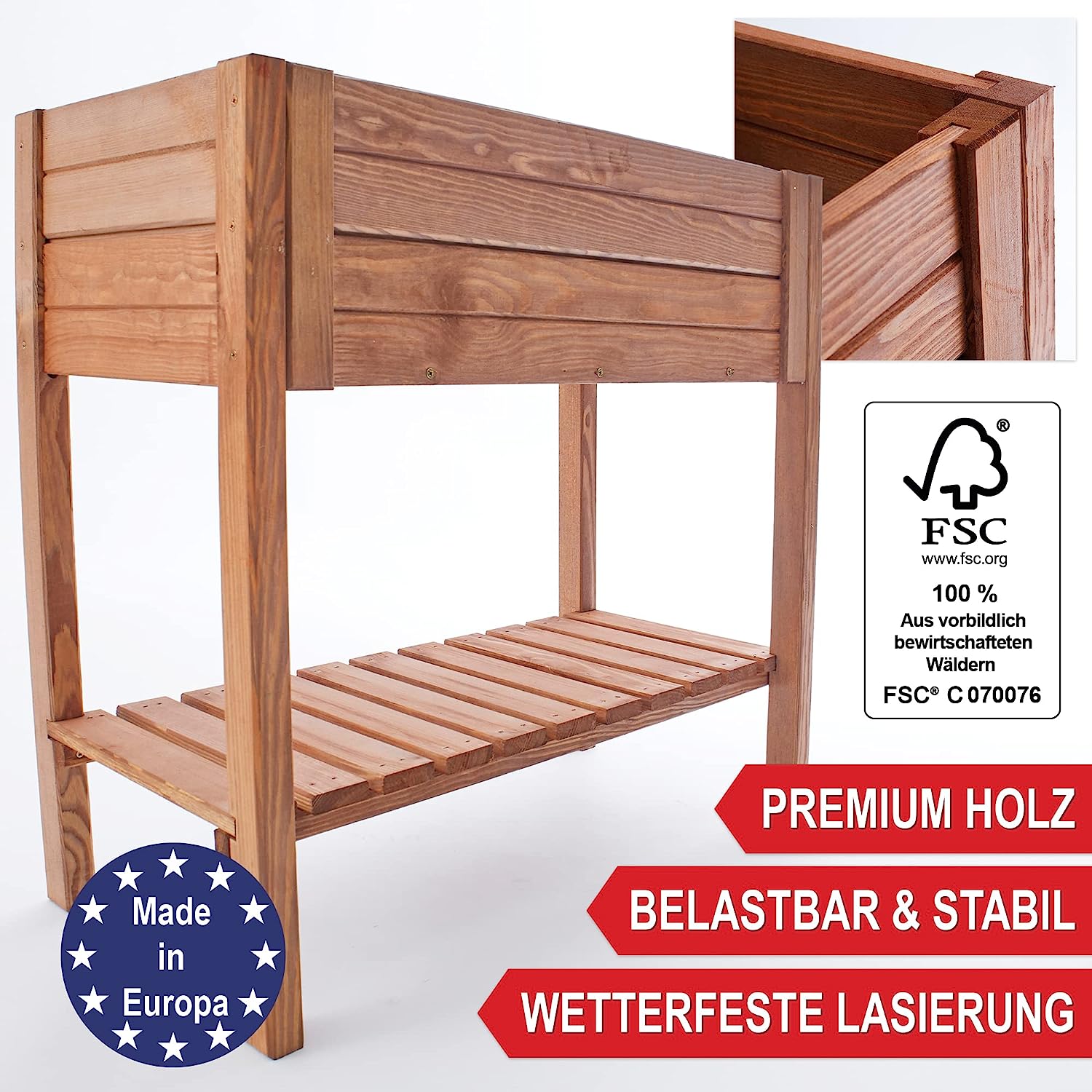 Das ca. 80 x 40 x 80 cm (L x B x H) große Hochbeet mit Ablage besteht aus hoch-wertigem und stabilem FSC zertifiziertem Holz. Es überzeugt durch gute Verarbeitung, stabile Konstruktion und hohe Belastbarkeit. Die wetterfeste dunkelbraune Lasierung schützt das Holz vor Witterungseinflüssen.