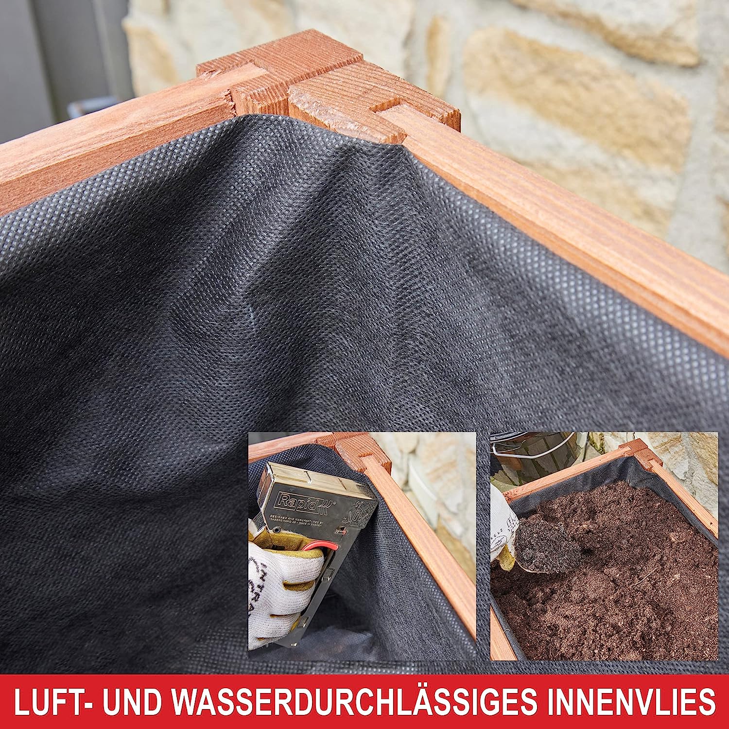 Zum Hochbeet wird ein passendes luft- und wasserdurchlässiges Innenvlies mitgeliefert. Das Vlies ist wetterbeständig und reißfest, wodurch das Holz optimal geschützt wird. Unterhalb des Beetes ist eine großzügige Ablagefläche angebracht, welche Sie optimale zum Ablegen von Pflanzutensilien, wie Schaufel, Setzlingen usw. nutzen können.