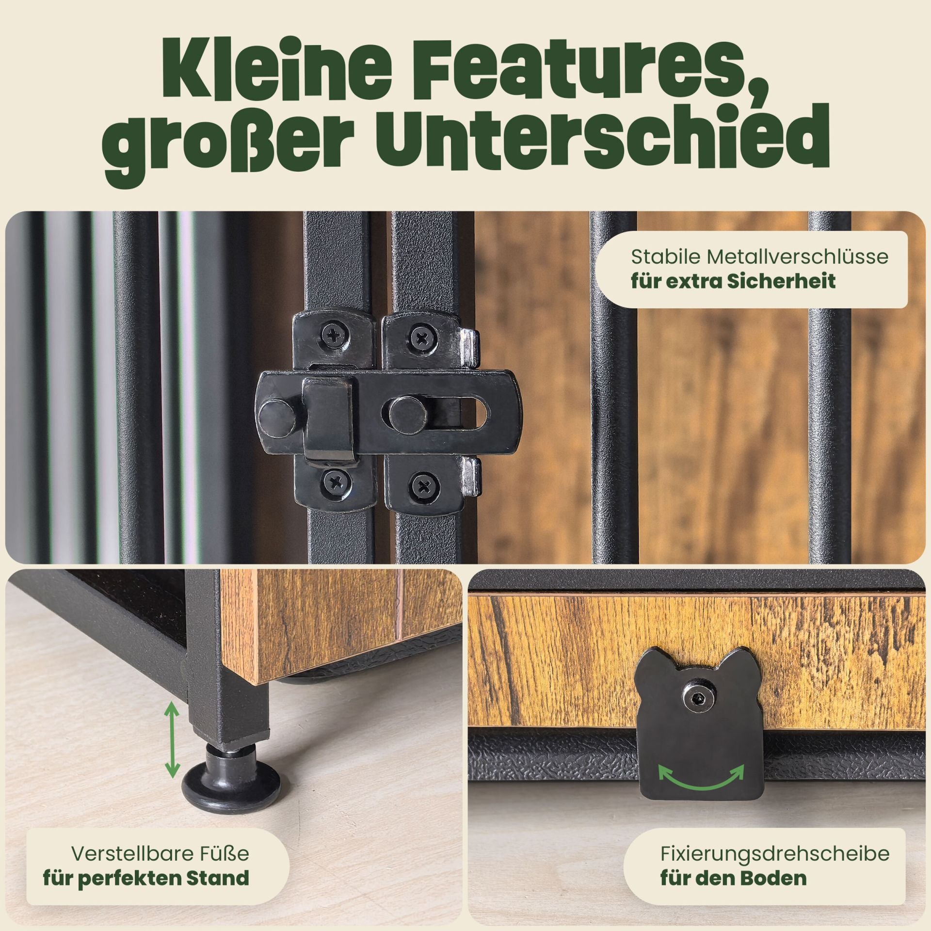 Das Hundehaus Max ist mehr als nur eine Hundebox – es ist Rückzugsort, Möbelstück und Wohnaccessoire zugleich. Mit rustikalem Holzdesign und stabilem Metallrahmen fügt es sich harmonisch in jedes Zuhause ein und bietet deinem Hund einen sicheren und gemütlichen Platz zum Entspannen.