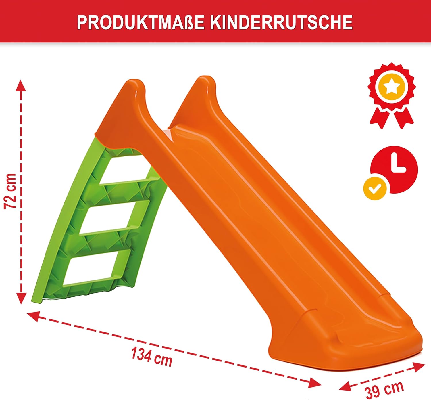 • EINFACH & SCHNELL AUFGEBAUT – Die orange-grüne Kinderrutsche ist werkzeuglos im Handumdrehen aufgebaut. Rutschstrecke auf die Stufen stecken (1), einklicken (2) – fertig & sicher!