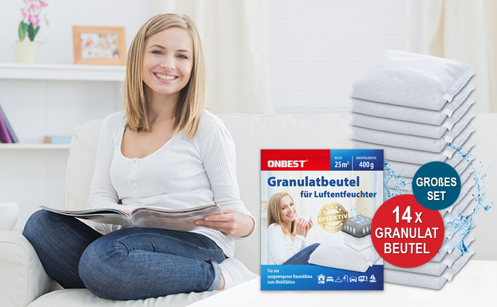 Das große Set enthält 14 Nachfüllbeutel mit je 400g premium Granulat. Die Beutel des Nachfüllpack sind für alle gängigen Luftentfeuchter geeignet. So haben Sie immer genügend Ersatz parat. Ideal für Wohnräume, Keller, Garage, Dachboden, Bad, Auto etc.