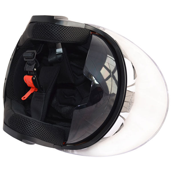 Das Innenpolster ist anschmiegsam, vermittelt ein angenehmes Tragegefühl und lässt sich heraus nehmen. Den Kinnriemen können Sie verstellen und so optimal auf sich anpassen, damit der Helm perfekt sitzt. Der Kinnriemen wird bei diesem Motorradhelm mit einem Ratschenverschluss geschlossen. Dies ist ganz einfach sogar mit Handschuhen möglich.