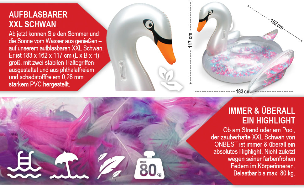 Der aufblasbare XXL Schwan ist das Highlight an Pool und Strand für jede Menge Spaß im Wasser. Das zauberhafte Schwan-Design mit pinken, weißen, blauen und violetten Federn macht den ONBEST Schwan zum Blickfang und sorgt bei Groß und Klein für Begeisterung auf der nächsten Poolparty.