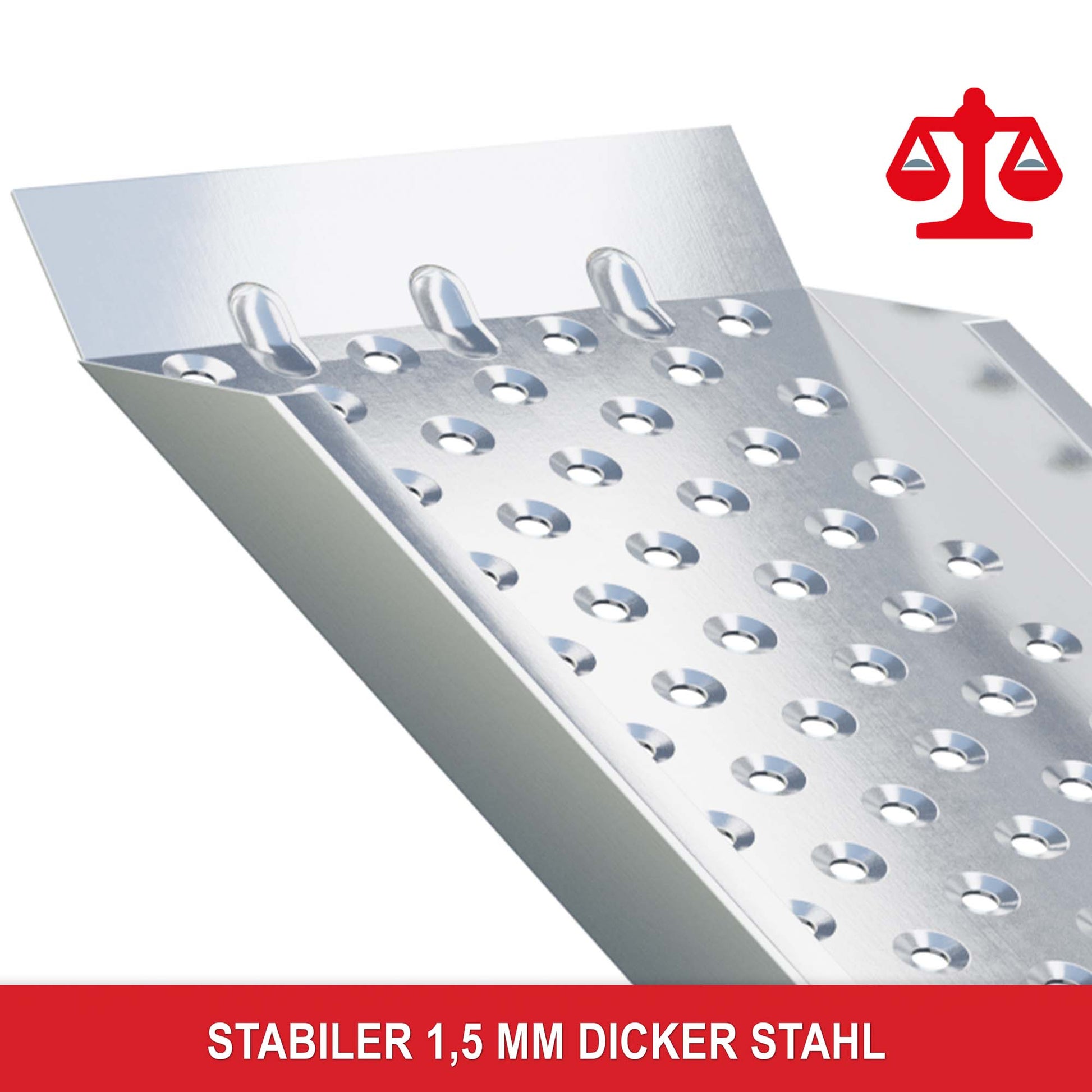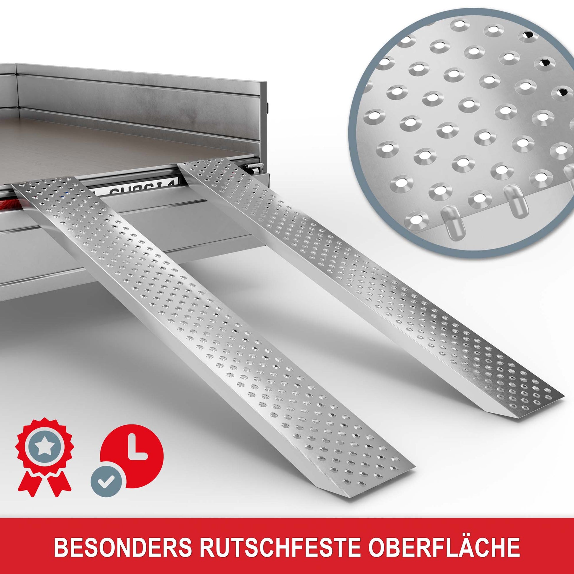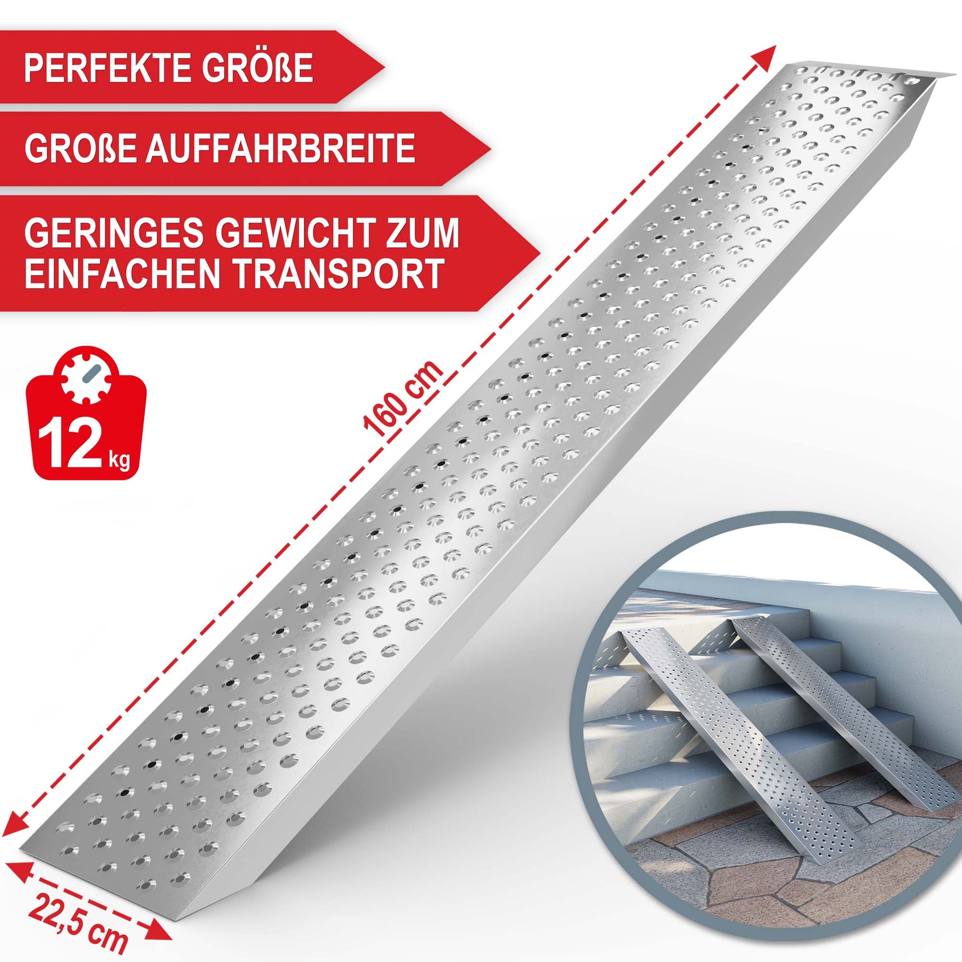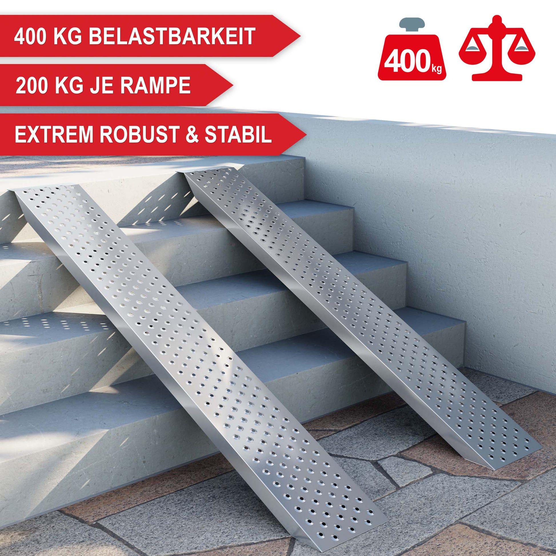Die beiden Auffahrrampen aus 1,5 mm dickem Stahl sind der ideale Allrounder für Haus, Garten und Werkstatt. Mit einer Tragkraft von 400 kg und einer Breite von 22,5 cm sind sie perfekt für den Transport von Motorrädern, Fahrrädern, Schubkarren, Rollstühlen, Sackkarren und Quads geeignet.